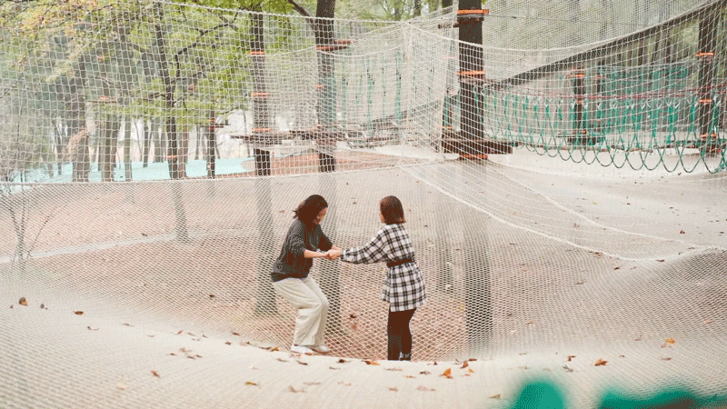 霍比特小屋、仓鼠隧道、跷跷板、独木桥……足足有32个童趣小关卡,等待丛林小勇士们来挑战。就连安全网也够小朋友玩好久:不同于一般的蹦床,它是一大片弹力十足的柔软蹦网,踩上去有“diudiudiu”的奇妙触感,像踩在Q弹软蓬蓬的云朵上。线路下方有大片的松软土地,明年春天,这里会种满大片的郁金香,等待小朋友来花海尽情撒欢。鞋底还带着泥巴,重新踩上结实的水泥地面时,还在不停回味刚才的冒险时光。下次去磨山秋游,还要再去丛林中“飞”一趟,秋日幸福清单,+1!